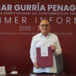 Con la presencia de regidores, síndico municipal y Secretario General del ayuntamiento, el ejecutivo municipal hizo la presentación oral y por escrito del estado que guarda la administración municipal a un año de gobierno y  resaltó que la entrega del Primer Informe de Gobierno al cabildo local, obedece al seguimiento del Plan Municipal de Desarrollo conforme a cinco ejes: Desarrollo Humano y Social, Crecimiento Económico Sostenido, Servicios Públicos Eficientes y de Calidad, Seguridad Ciudadana Justa y Responsable, Gestión para la Preservación del Medio Ambiente y sus Recursos Naturales.