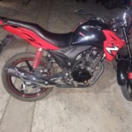 cinco cartuchos útiles y una motocicleta de color negra con rojo.