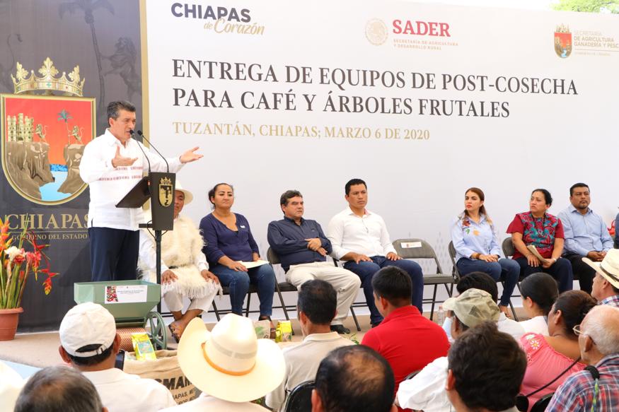 • En Tuzantán, el gobernador entregó de manera directa y sin intermediarios mil 24 máquinas despulpadoras de café y dos mil plantas frutales
