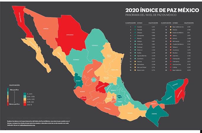 • Señaló que de acuerdo con este análisis internacional, el alto nivel de paz en México lo encabezan Yucatán, Tlaxcala, Chiapas, Campeche y Nayarit