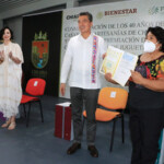 Estuvieron presentes: la secretaria de Turismo, Katyna de la Vega Grajales; la secretaria de Bienestar, Adriana Grajales Gómez; el diseñador originario del municipio de Aldama, Alberto López Gómez, así como artesanas y artesanos galardonados.