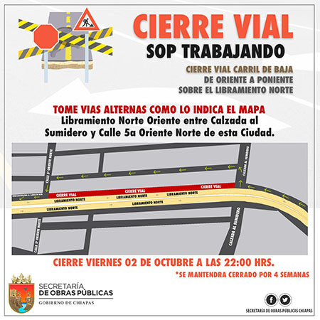 La Secretaría de Obras Públicas del Estado (SOP), a través de la Dirección de Obras Viales, en coordinación con la Dirección de Tránsito Municipal, analizó la logística del cierre vial y las rutas alternas, como parte de los trabajos de rehabilitación de drenaje que se realizarán en el carril de baja, de oriente a poniente, del Libramiento Norte, entre la Calzada al Sumidero y 5ª Oriente, en la ciudad de Tuxtla Gutiérrez.