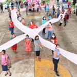 Autoridades ejidales y municipales, formaron el moño rosa como símbolo del compromiso que las mujeres deben asumir para cuidar su salud y prevenir el cáncer de mama que es curable si se detecta a tiempo.