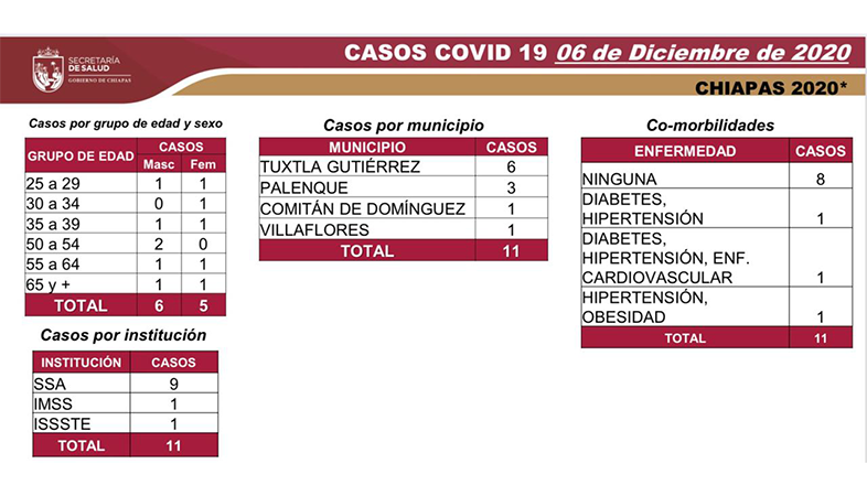 Los casos nuevos se presentaron en los siguientes municipios: Tuxtla Gutiérrez, seis; Palenque, tres; y Comitán y Villaflores, un caso cada uno.