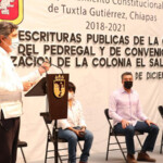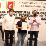 El presidente municipal de Tuxtla Gutiérrez, Carlos Morales Vázquez, acompañó al gobernador Rutilio Escandón Cadenas en la entrega de Escrituras Públicas de la Colonia Jardines del Pedregal y de Convenios de Regularización de la colonia El Salvador, dando respuesta a una demanda añeja y brindar certeza jurídica al patrimonio familiar de los beneficiados.