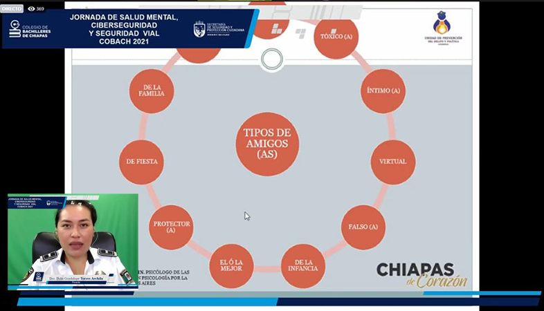 Con el tema “Amistades Seguras”, continuó la Jornada de Salud Mental, Ciberseguridad y Seguridad vial Cobach 2021, que impartió Dalia Guadalupe Torres Archila, adscrita a la Secretaría de Seguridad y Protección Ciudadana (SSyPC), la cual fue dirigida a docentes, administrativos, directivos y encargados de centros EMSaD del Colegio de Bachilleres (Cobach), con recomendaciones de cómo adquirir buenas amistades.