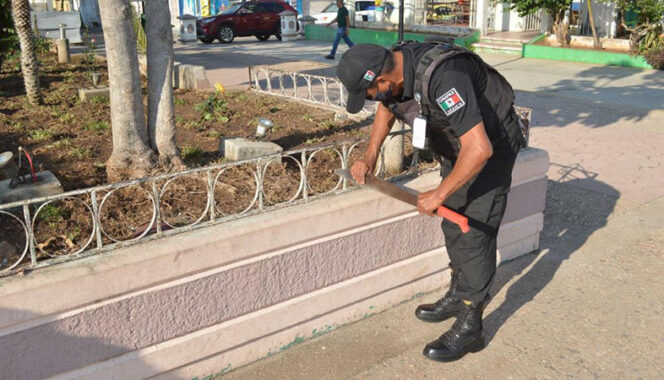 Elementos de la policía municipal a través de labor social se suman a la campaña “Por Un Jiquipilas Limpio y Seguro” para embellecer el parque central.