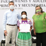 Junto a la directora general del Instituto Nacional para la Educación de los Adultos (INEA), Teresa Guadalupe Reyes Sahagún, reconoció el esfuerzo de egresadas y egresados de este sistema por contribuir en el combate al rezago educativo, e hizo una mención especial a Evandro Gómez Espinosa, originario de Las Margaritas que, a sus 87 años, terminó la educación primaria: “Felicidades, sigan adelante no se arrepentirán porque la educación abre caminos e ilumina la vida”.