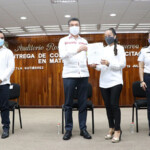 Estuvieron presentes: la secretaria de Seguridad y Protección Ciudadana, Gabriela Zepeda Soto; el director general del Instituto de Formación Policial, Nicolás de Jesús Trinidad Náfate; la beneficiaria Cynthia Marlene Figueroa Pérez, entre otros.