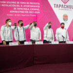 Con la presencia del gobernador Rutilio Escandón Cadenas, en sesión solemne de Cabildo, rindió protesta el Ayuntamiento Municipal de Tapachula para el periodo 2021-2024, presidido por la maestra Rosa Irene Urbina Castañeda, quien reiteró su compromiso con el desarrollo, bienestar y felicidad de los tapachultecos.