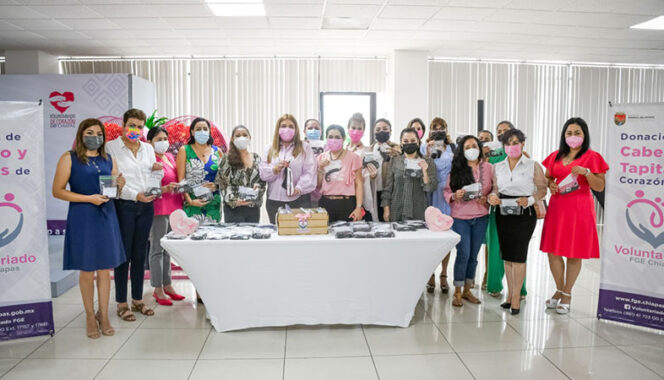 Con el objetivo de apoyar a las personas con cáncer en el estado de Chiapas, el Voluntariado de la Fiscalía General del Estado (FGE), que preside Irasema Gómez Hipólito, realizó la donación de cabello y tapitas al Voluntariado de Corazón del Sistema DIF Chiapas.