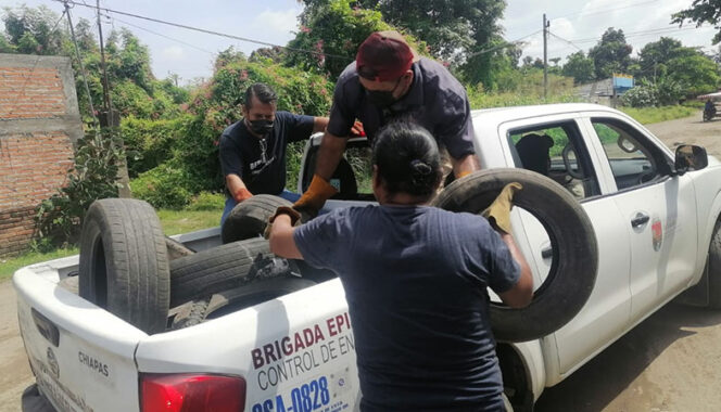 En seguimiento a las instrucciones de la presidenta municipal, Rosa Irene Urbina Castañeda, las brigadas de la Secretaría de Salud Municipal en coordinación con el gobierno del estado, mantienen los trabajos que buscan erradicar los objetos que se convierten en potenciales criaderos del mosco transmisor del dengue, zika y chikungunya, padecimientos que atentan contra la salud de los tapachultecos.