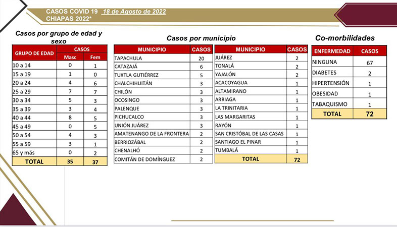 En ese sentido, la dependencia estatal informó que los casos se registraron de la siguiente manera: Tapachula (20), Catazajá (6), Tuxtla Gutiérrez (5), Chalchihuitán (3), Chilón (3), Ocosingo (3), Palenque (3), Pichucalco (3), Unión Juárez (3), Amatenango de la Frontera (2), Berriozábal (2), Chenalhó (2), Comitán (2), Juárez (2), Tonalá (2), Yajalón (2) y con un sólo caso los municipios de Acacoyagua, Altamirano, Arriaga, La Trinitaria, Las Margaritas, Rayón, San Cristóbal de Las Casas, Santiago El Pinar y Tumbalá.