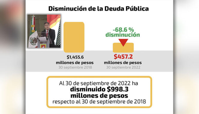 El edil capitalino refirió que, de la Deuda Pública del Municipio, desde el 30 de septiembre de 2018 ascendía a los $1,455.6 millones de pesos, y de eso, al 30 de septiembre de 2022, durante el primer año de la segunda administración, se redujo a $457.2 millones, es decir el 68.6 por ciento menos de lo que era hace 4 años.