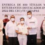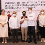 Durante la entrega de 850 títulos de especialidad a egresados del Colegio de Estudios Científicos y Tecnológicos del Estado de Chiapas (CECyTE Chiapas) de la promoción 2022, quienes se incorporarán al desarrollo profesional o se encuentran cursando el nivel superior, el gobernador Rutilio Escandón Cadenas felicitó a la comunidad estudiantil y refrendó su compromiso de seguir invirtiendo en el fortalecimiento de la educación en Chiapas.