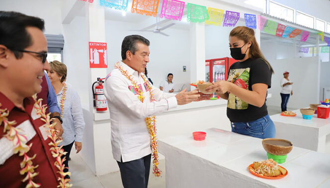 “Estoy feliz de que los sueños se están haciendo realidad, pues este mercado necesitaba construirse nuevamente, y después de muchos años de abandono hoy ha quedado muy bonito, en buenas condiciones y saludable para la venta de productos. Les digo a las y los locatarios que estamos poniendo en sus manos este centro de abasto, está bajo su resguardo para que, junto con sus autoridades, lo cuiden y le den mantenimiento porque es patrimonio del pueblo. Esto y más se merece Berriozábal”, apuntó.