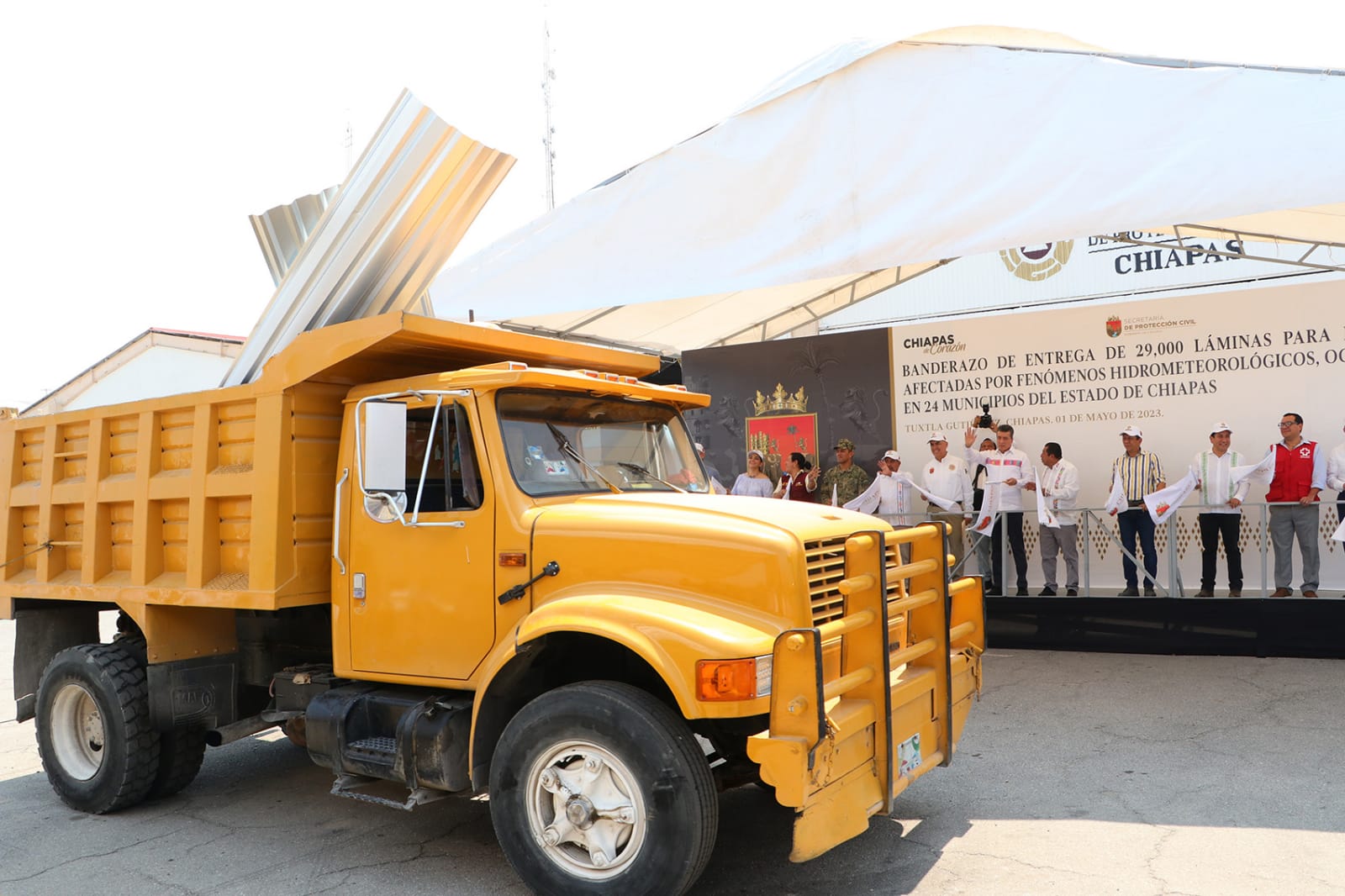 Desde la Explanada de la Secretaría de Protección Civil, el gobernador Rutilio Escandón Cadenas dio banderazo a la entrega de 29 mil láminas a familias de 24 municipios que fueron afectadas por lluvias y vientos, y benefició a brigadistas con equipamiento para el fortalecimiento al combate de incendios, así como a la Cruz Roja Mexicana Delegación Chiapas con una ambulancia equipada.