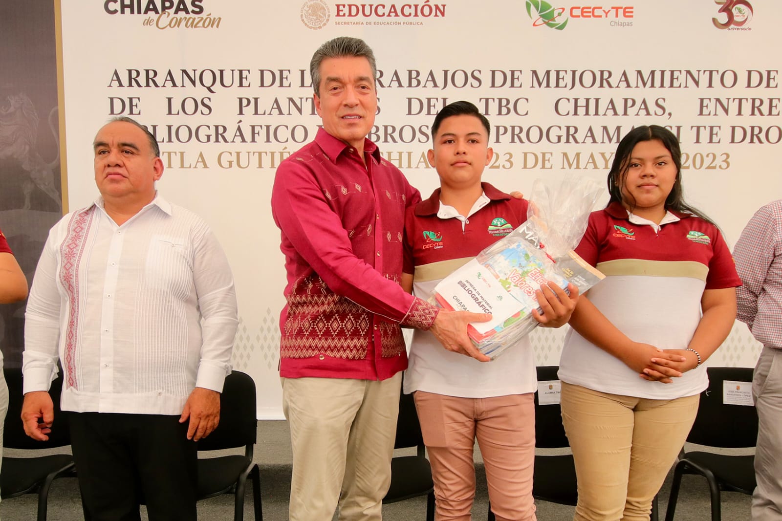 Desde el municipio de Tuxtla Gutiérrez, el gobernador Rutilio Escandón Cadenas encabezó el arranque de los trabajos de mejoramiento de infraestructura educativa para 12 planteles del Telebachillerato Comunitario (TBC), que pertenecen al Colegio de Estudios Científicos y Tecnológicos del Estado de Chiapas (Cecytech), así como la entrega de materiales educativos y recursos didácticos del programa “Si te drogas, te dañas”.
