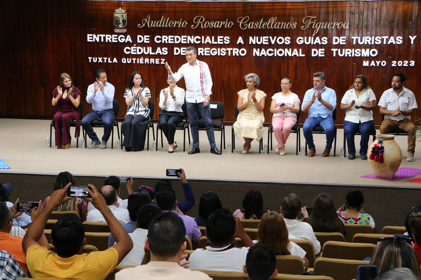 Aunque Chiapas siempre tuvo presencia turística, hoy se ha incrementado debido a que hay inversión federal y estatal que facilita la llegada de más visitantes, expresó el gobernador Rutilio Escandón Cadenas durante la entrega de 38 acreditaciones a nuevos guías de turistas y 61 Cédulas del Registro Nacional de Turismo a empresas y negocios prestadores de servicios.