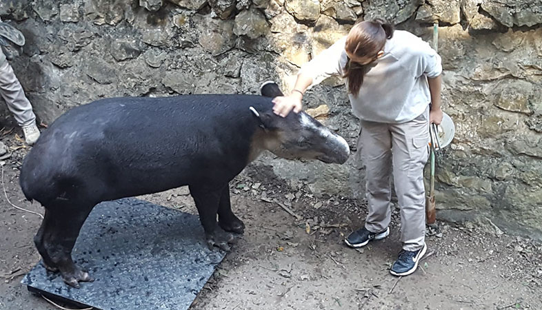 Para lo anterior se aplican técnicas de enriquecimiento ambiental y condicionamiento operante, principalmente con objetivos médicos, es decir, reducir el estrés en las revisiones rutinarias y aplicación de tratamientos preventivos y correctivos.