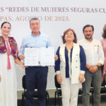 Los secretarios de Bienestar, Rodolfo Moguel Palacios; y de Economía y del Trabajo, Carlos Alberto Salazar Estrada; los directores generales del Instituto Chiapaneco de Educación para Jóvenes y Adultos, Gustavo Gómez Ordóñez; y de la Promotora de Vivienda Chiapas, Freddy Escobar Sánchez; así como las usuarias de Redes de Mujeres Seguras Cuadra por Cuadra, Ana Karen Álvarez Méndez y Araceli Cifuentes Ochoa.