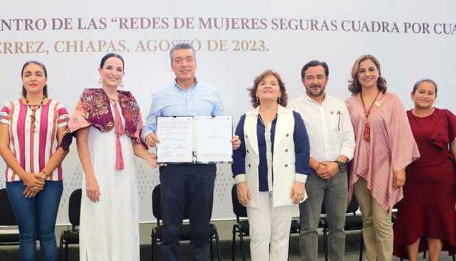 Al atestiguar la firma del acuerdo institucional para la Estrategia Estatal Redes de Mujeres Seguras Cuadra por Cuadra, en el marco de la Estrategia Nacional de Mujeres Constructoras de Paz, destacó que en Chiapas se hace causa común con la Federación para fortalecer las acciones a favor de la recuperación de espacios públicos, el establecimiento de entornos seguros, el combate de la violencia de género y la participación comunitaria femenina en los ámbitos económico, político y social.