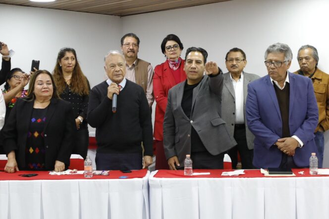En las oficinas de la sede del PT en la Ciudad de México, el coordinador nacional del PT, Alberto Anaya, tomó protesta al coordinador de los Comités de Defensa de la Cuarta Transformación, Eduardo Ramírez, tras haber sido elegido por unanimidad.