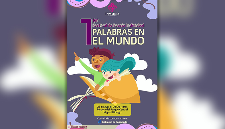 El Ayuntamiento de Tapachula a través de la Secretaría de Educación y Cultura Municipal, te invita a participar en el Primer Festival de Poesía Individual “Palabras en el Mundo”, consulta la convocatoria en el Facebook Gobierno de Tapachula e inscríbete, la cita es el próximo 26 de junio a partir de las 09:00 horas en la pérgola del parque central “Miguel Hidalgo”.