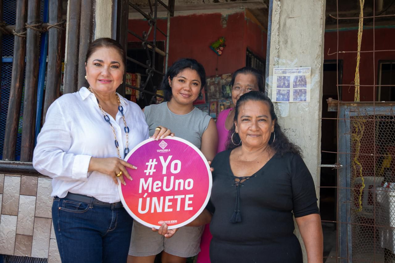 Al encabezar la brigada casa por casa en la colonia Vida Mejor, la presidenta municipal de Tapachula, Gladiola Soto Soto, entregó trípticos informativos sobre los servicios que otorga el Módulo de Atención Inmediata a Mujeres Víctimas de Violencia (MAI) de la Secretaría de Igualdad de Género Municipal.