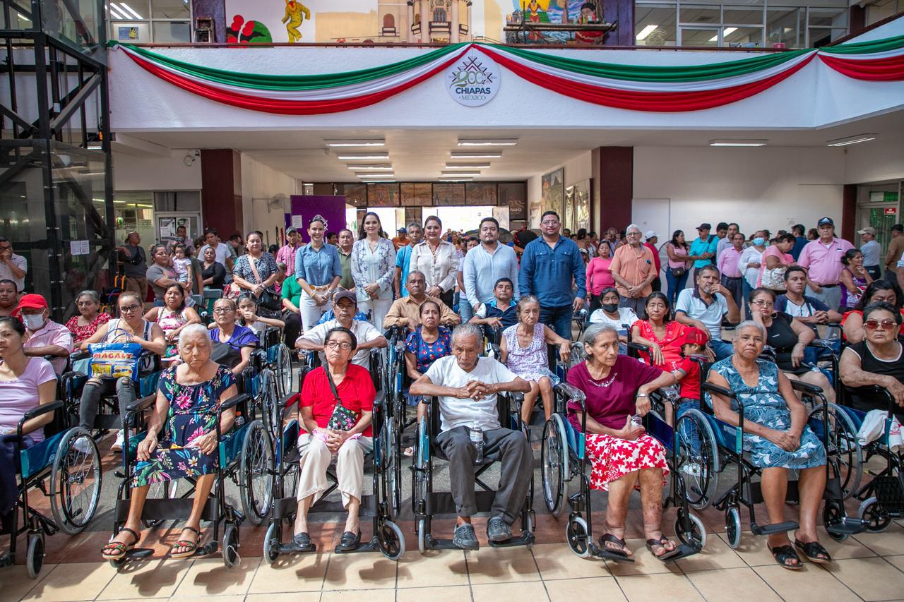 En la explanada interna del palacio, la presidenta municipal de Tapachula, Gladiola Soto Soto y la presidenta honoraria del Sistema DIF, Nora Raquel Soto Soto hicieron entrega de sillas de ruedas como parte de la atención a grupos vulnerables.
