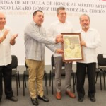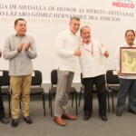- En Chiapa de Corzo, el gobernador hizo entrega de la Medalla al Mérito Artesanal Franco Lázaro Gómez Hernández a los hermanos Nandayapa Vargas, reconocidos por la construcción de marimbas