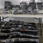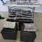 La madrugada de hoy, de manera simultánea, los efectivos cumplimentaron una orden de cateo en un rancho donde hallaron cinco armas de fuego largas, cuatro escopetas, tres paquetes que contenían una sustancia sólida con características propias del cristal y cuatro paquetes que contenían una sustancia similar a la cocaína.