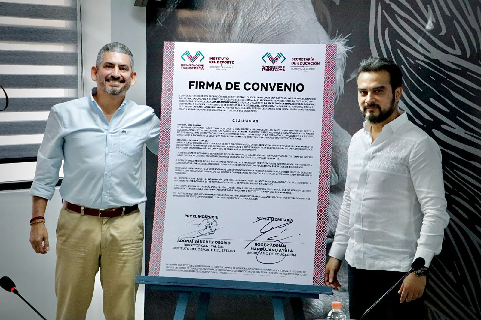 Bajo esa directriz, el secretario de Educación, Roger Mandujano Ayala y el director general del Instituto del Deporte del Estado de Chiapas (Indeporte), Adonaí Sánchez Osorio, concretaron este jueves un convenio de colaboración que tuvo lugar en las instalaciones de la dependencia educativa.