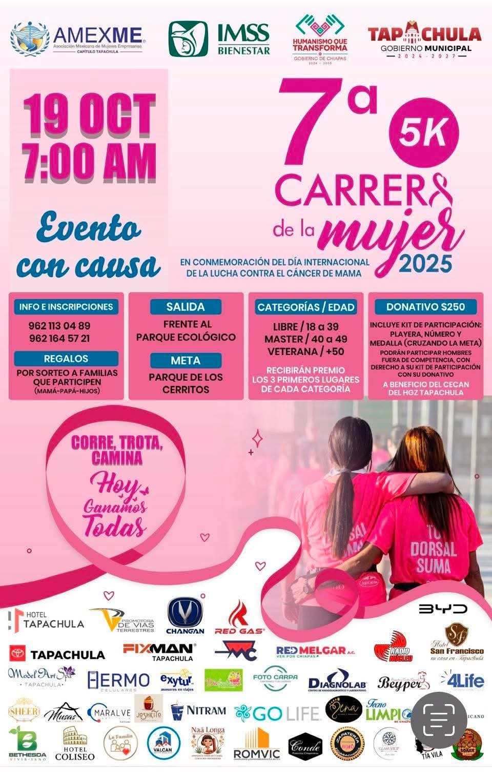 El Ayuntamiento de Tapachula que preside el alcalde Yamil Melgar Bravo, a través de la Secretaría de Juventud y Deporte Municipal, se sumó a la 7a. Carrera de la Mujer 2025 5K a realizarse el próximo 19 de octubre a las 7 de la mañana en el marco del Día Mundial de la Lucha Contra el Cáncer de Mama.