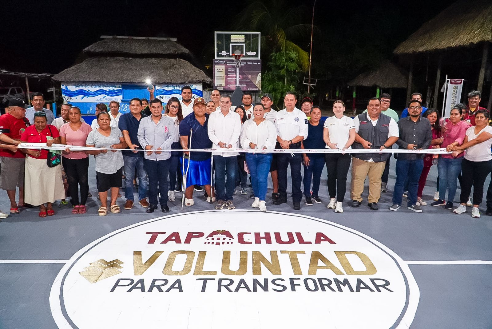 Como parte de las acciones integrales se realizó la aplicación de pintura antiderrapante en la cancha deportiva, la colocación de 2 tableros con base movible para básquetbol, 2 porterías movibles para fútbol y la instalación de 6 postes con lámparas solares de 100 watts, con lo que se mejora la iluminación y se promueve el uso seguro del espacio en horarios nocturnos.