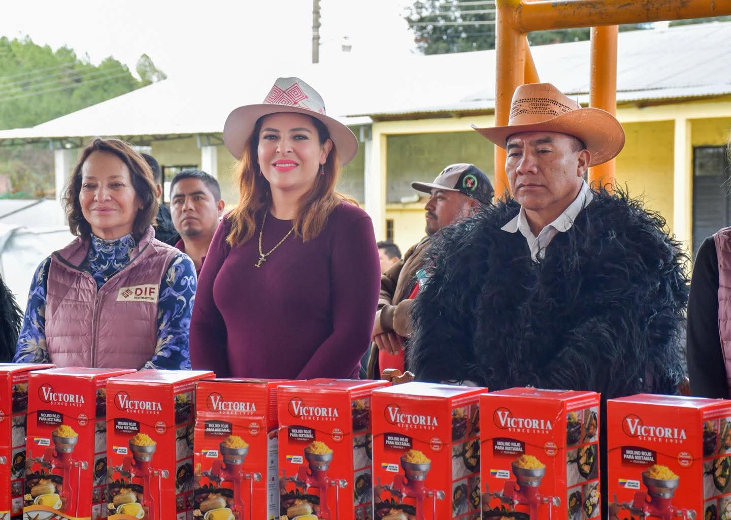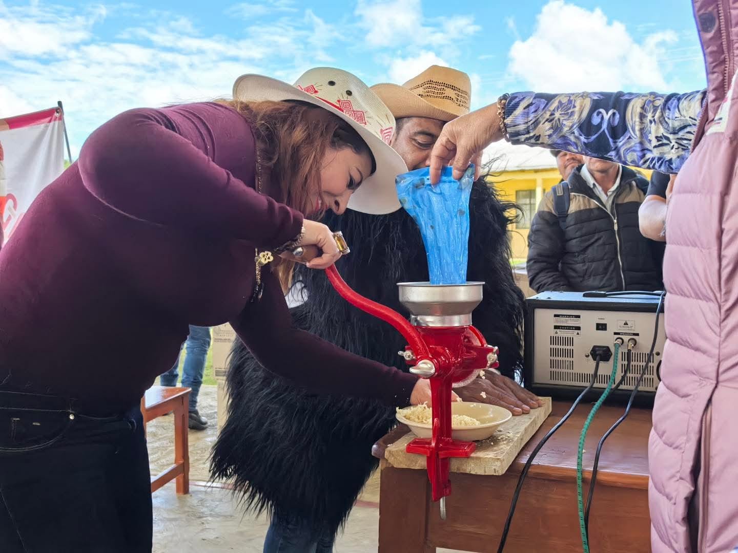 La presidenta municipal, Mtra. Fabiola Ricci Diestel, y la presidenta honoraria del DIF Municipal, Bertha Guadalupe Diestel Alfaro, realizaron la entrega de 220 molinos de nixtamal en la comunidad Predio Santiago, acompañadas del equipo del DIF y autoridades comunitarias, con el objetivo de fortalecer la economía familiar y preservar las tradiciones gastronómicas locales.