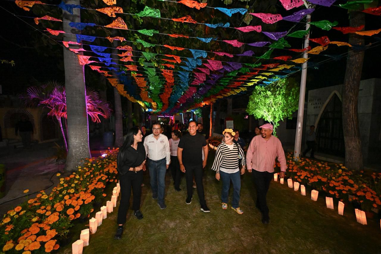 Durante el recorrido por el Panteón Municipal, reconoció el esfuerzo de la coordinadora de Atención Ciudadana, Anjuli Acosta Guillén, y de todas las personas que hicieron posible este trabajo. Además, informó que este recinto permanecerá abierto hasta las 12 de la noche, del jueves 30 de octubre al sábado 1 de noviembre, para que las familias puedan acudir con tranquilidad y seguridad a rendir homenaje a sus difuntos.