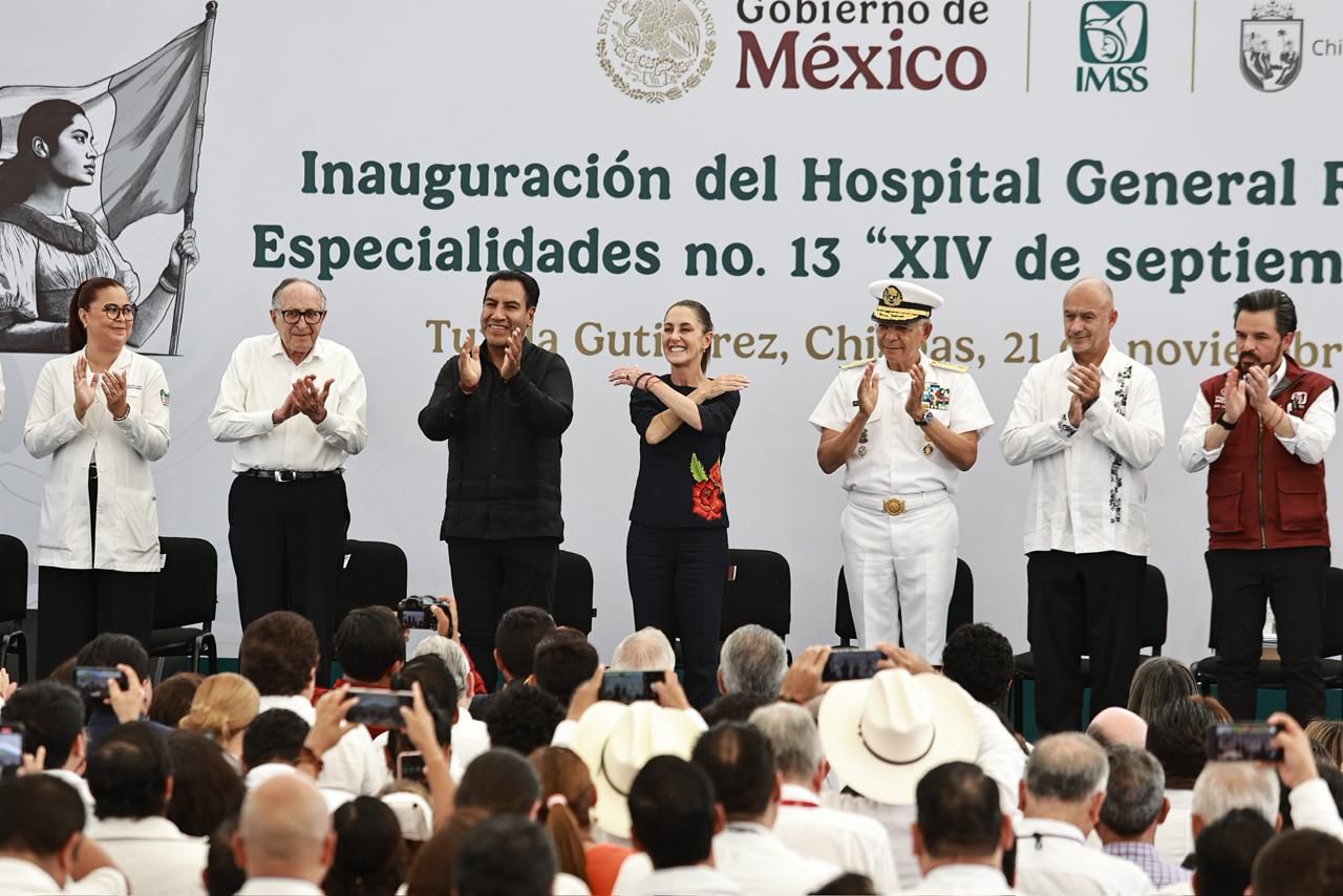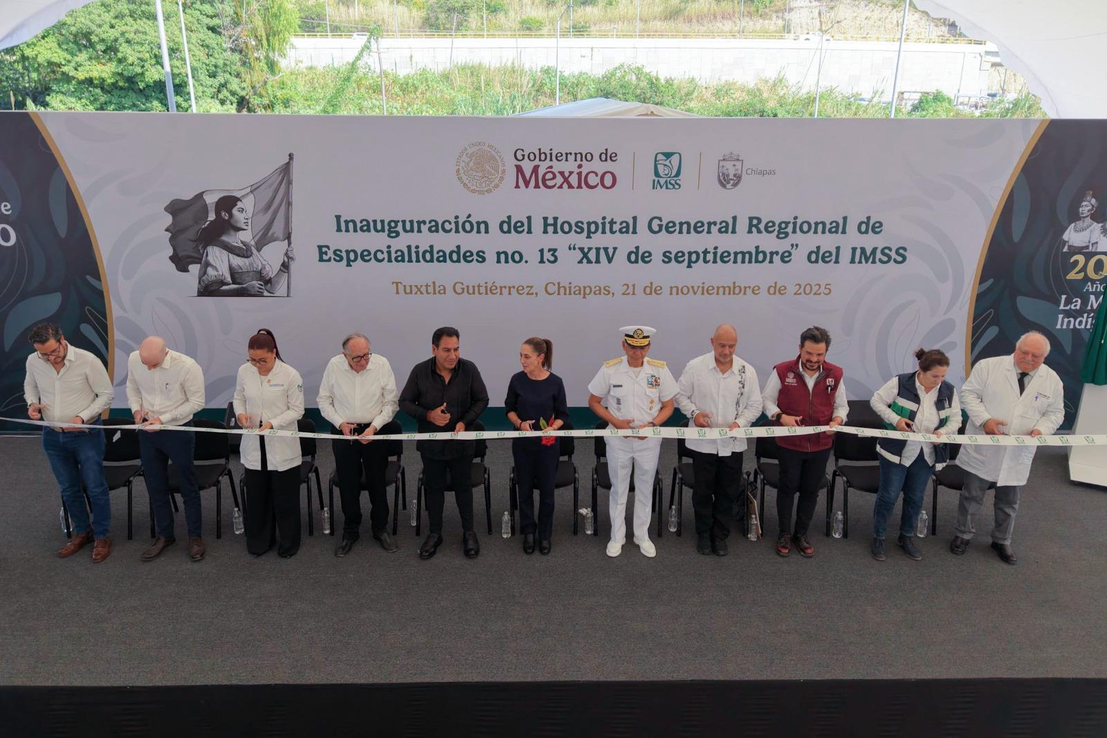 El gobernador Eduardo Ramírez Aguilar acompañó a la presidenta de la República, Claudia Sheinbaum Pardo, a la inauguración del Hospital General Regional de Especialidades No. 13 “XIV de septiembre” del Instituto Mexicano del Seguro Social (IMSS) en Tuxtla Gutiérrez. Durante este acto, agradeció al Gobierno de México por concretar esta magna obra que fortalecerá de manera integral los servicios de salud en beneficio de las y los derechohabientes de Chiapas y del Sureste.