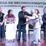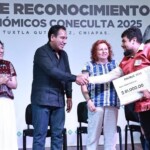El gobernador Eduardo Ramírez Aguilar encabezó la entrega de reconocimientos y apoyos económicos Coneculta 2025, correspondientes a los proyectos Tesoros Humanos Vivos, Premio Internacional de Poesía Jaime Sabines y Programa de Apoyo a las Culturas Municipales y Comunitarias (Pacmyc). En este acto, subrayó que el gobierno de la Nueva ERA mantiene un firme compromiso con la preservación de los saberes ancestrales y con la visibilización de la riqueza cultural de Chiapas.