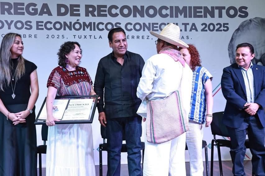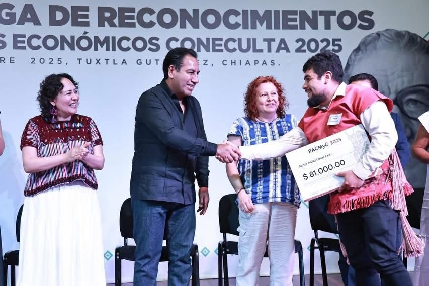 Asimismo, se otorgó el Premio Internacional de Poesía Jaime Sabines 2025 a Julio César Melo Toledo por el poemario inédito Botánica Forense. En lo que respecta al Pacmyc, emisión 2025, se benefició a Aracelis Montero Zambrano, representante del proyecto Elaboración y Exposición de Muñecas de Jolochi, del municipio de Villaflores; a Pablo Rafael Díaz Cruz, representante del Proyecto Museo Itinerante de Textil de los Altos de Chiapas, de Zinacantán; y a Candelaria Vázquez Morales, con el proyecto Ptet Chulel, rescate de las técnicas ancestrales del algodón en los huipiles de Venustiano Carranza.