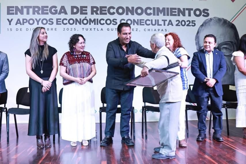 El gobernador Eduardo Ramírez Aguilar encabezó la entrega de reconocimientos y apoyos económicos Coneculta 2025, correspondientes a los proyectos Tesoros Humanos Vivos, Premio Internacional de Poesía Jaime Sabines y Programa de Apoyo a las Culturas Municipales y Comunitarias (Pacmyc). En este acto, subrayó que el gobierno de la Nueva ERA mantiene un firme compromiso con la preservación de los saberes ancestrales y con la visibilización de la riqueza cultural de Chiapas.