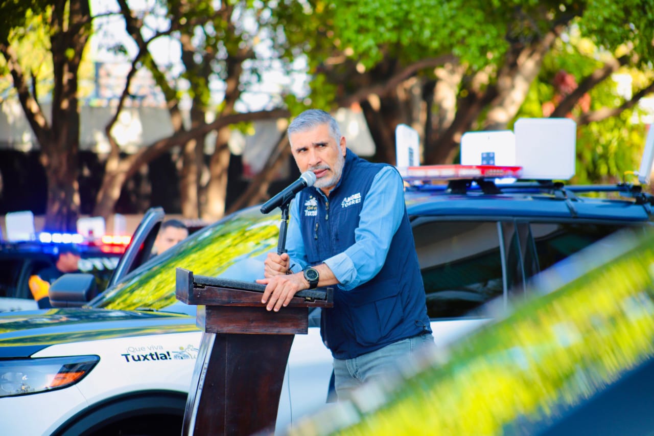 En compañía del Fiscal General del Estado, Jorge Luis Llaven Abarca, y del Secretario de Seguridad del Pueblo, Óscar Alberto Aparicio, el presidente municipal Angel Torres presentó las Unidades Especializadas en Recuperación de Vehículos, como parte del fortalecimiento de las tareas de seguridad en Tuxtla.