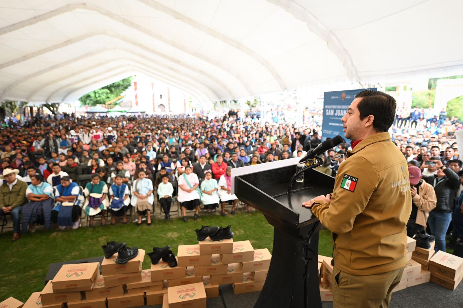 Durante la jornada, el mandatario atestiguó la votación a mano alzada mediante la cual las y los habitantes eligieron de forma libre y democrática la realización de una obra de electrificación, al considerarla un proyecto social prioritario. Asimismo, entregó calzado deportivo a mil 722 niñas y niños como parte del programa A Paso Firme; becas Rosario Castellanos para la alfabetización; y kits invernales a población en condiciones de vulnerabilidad.