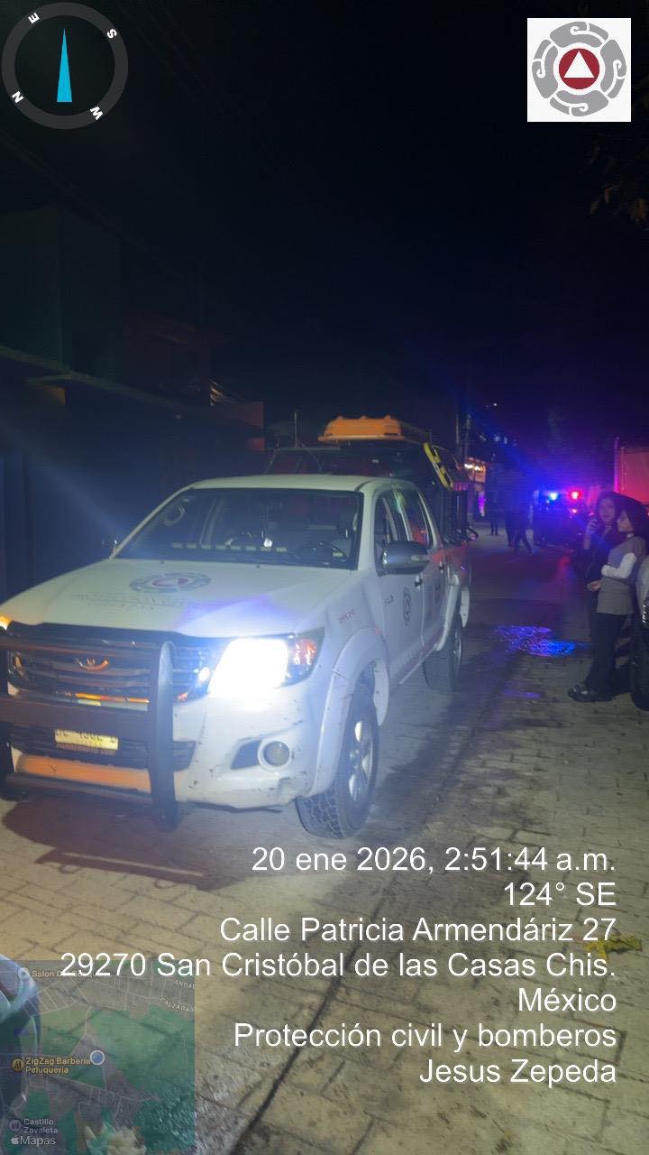 Elementos de Protección Civil Municipal de San Cristóbal de Las Casas respondieron de manera oportuna y coordinada al reporte de una explosión, presuntamente causada por pirotecnia, ocurrida en la calle Patricia Armendáriz número 24, entre José Wever y la calle Las Comaleras, en el barrio de San Diego, logrando el control inmediato de la situación.