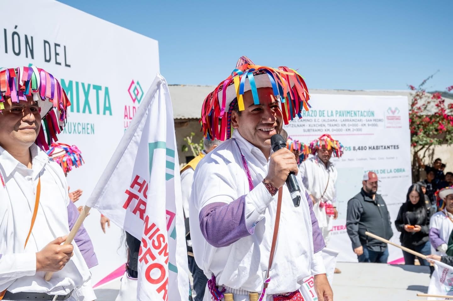 Posteriormente, en Aldama, dio el banderazo de inicio a la pavimentación mixta del camino Aldama-Larráinzar-San Pedro Cotzilnam-Xuxchen, obra que beneficiará a más de ocho mil habitantes y fortalecerá la actividad social y económica de la zona. En la localidad Yetón puso en marcha el sistema de agua potable, con una inversión superior a 9.8 millones de pesos; entregó calzado escolar a niñas y niños mediante el programa A Paso Firme y dio a conocer nuevas acciones para mejorar la infraestructura educativa.
