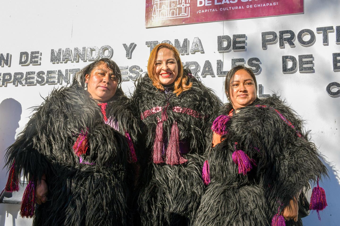 Durante el acto, mujeres de la localidad de la Sierra colocaron a la presidenta municipal la vestimenta tradicional de los Altos de Chiapas, en un gesto de reconocimiento que la acredita como la máxima autoridad de las autoridades rurales del municipio.