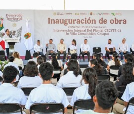 El gobernador Eduardo Ramírez Aguilar, acompañado por la directora general de Obras Comunitarias de la Secretaría de Desarrollo Agrario, Territorial y Urbano (Sedatu), Ana Gabriela Villanueva Huerta, en representación de la secretaria Edna Vega Rangel, y por el vicealmirante retirado, Octavio Sánchez Guillén, director general del Corredor Interoceánico del Istmo de Tehuantepec (CIIT), inauguró obras en los planteles 06 Acapetahua y 03 Villa Comaltitlán del Colegio de Estudios Científicos y Tecnológicos de Chiapas, realizadas mediante la Vertiente Obras Comunitarias, con una inversión cercana a los 10 millones de pesos.