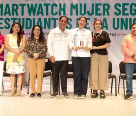 El gobernador Eduardo Ramírez Aguilar entregó dispositivos smartwatch del Programa Mujer Segura: Presiona, Activa y Alerta a alumnas de la Universidad Autónoma de Ciencias y Artes de Chiapas (Unicach), en Tuxtla Gutiérrez. Destacó que el objetivo del gobierno de la Nueva ERA es que las mujeres vivan con tranquilidad y sientan la protección permanente de las autoridades.