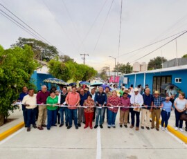 Acompañado de vecinas y vecinos, el presidente Angel Torres inauguró más de 240 metros lineales de pavimentación con concreto hidráulico, servicios básicos, alumbrado público y pintura en la fachada de las viviendas, en el ejido Copoya.