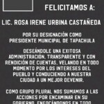 En el mismo sentido se pronunció el Bloque de Transportistas Concesionados de Tapachula, entre otras organizaciones que expresaron su beneplácito por el nombramiento de Urbina Castañeda, a quien calificaron como una mujer comprometida y responsable para llevar las riendas de la administración pública local.